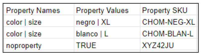 separar por |. Si el producto no tiene variantes se debe poner “noproperty”. Las variantes se pueden ver en la pestaña de “Importar productos” de shopadmin