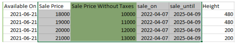 En caso de tener productos con oferta, se tiene que armar otro archivo con estos productos y agregar las siguientes columnas entre “Avalible On” y “Height”: