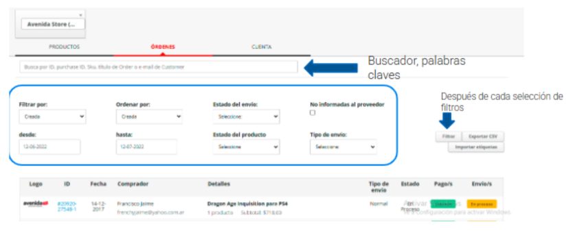 Dentro del apartado de órdenes pueden encontrar diferentes filtros para buscar órdenes.