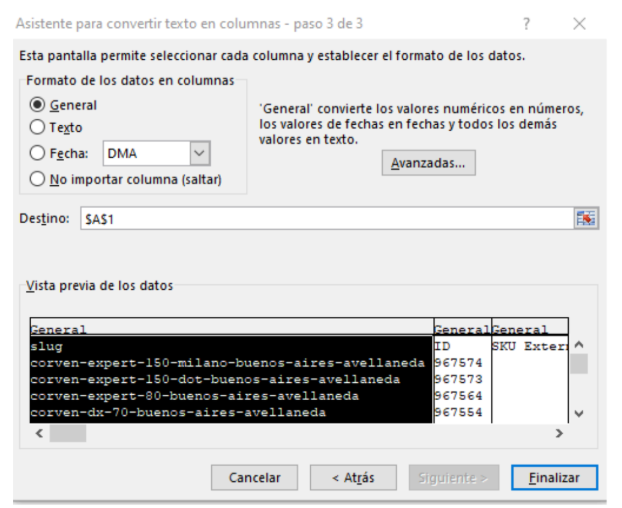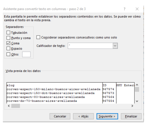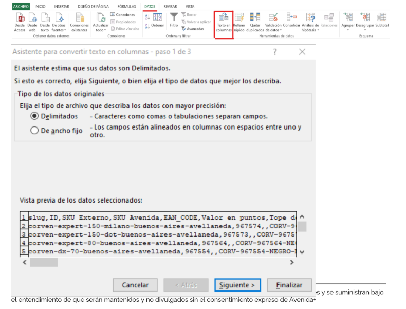 columnas y elegir la opción por defecto (delimitados), separar por coma, finalizar. De esta manera les quedaría el texto separado en columnas.