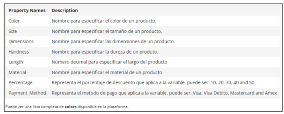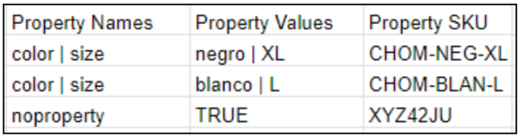 Nombre de la variante del producto, por ejemplo: color o size. Si se desea agregar más de una variante se deben separar por |. Si el producto no tiene variantes se debe poner “noproperty”. Las variantes se pueden ver en la pestaña de “Importar productos” de shopadmin.