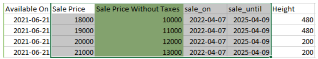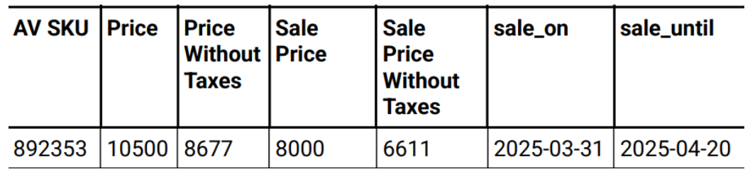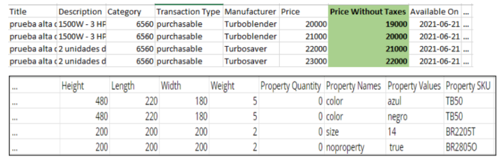 En caso de tener productos con oferta, se tiene que armar otro archivo con estos productos y agregar las siguientes columnas entre “Avalible On” y “Height”: