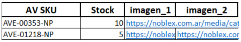 3. Cargaremos los links de las imágenes en su respectiva columna. Es importante que la imagen sea de un dominio público, como puede ser su tienda web o un servidor propio, también deben verificar que el hipervínculo se enlace correctamente.